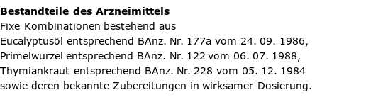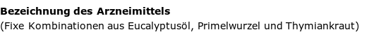 Fixe Kombinationen aus Eucalyptusöl, Primelwurzel und Thymiankraut (bb 2) Erscheinungsdatum Bundesanzeiger: 04.04.1992., Heftnummer: 67. Monographie BGA/BfArM (Kommission E)
